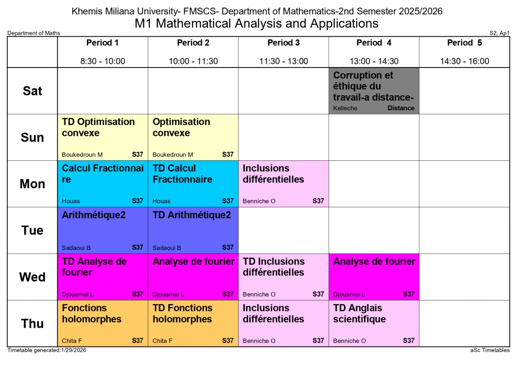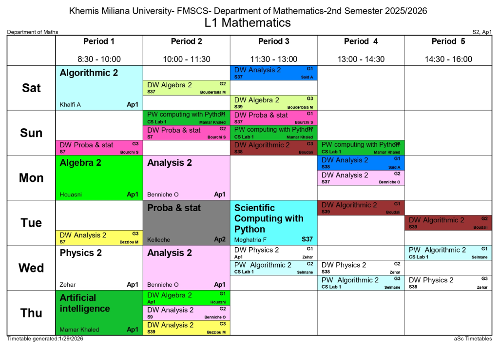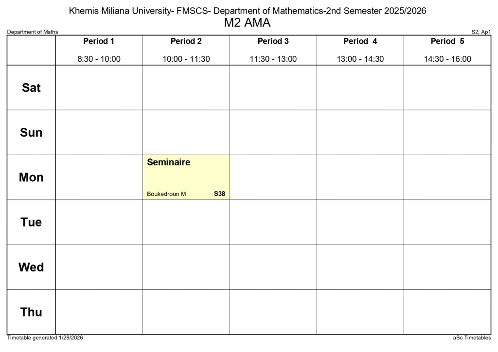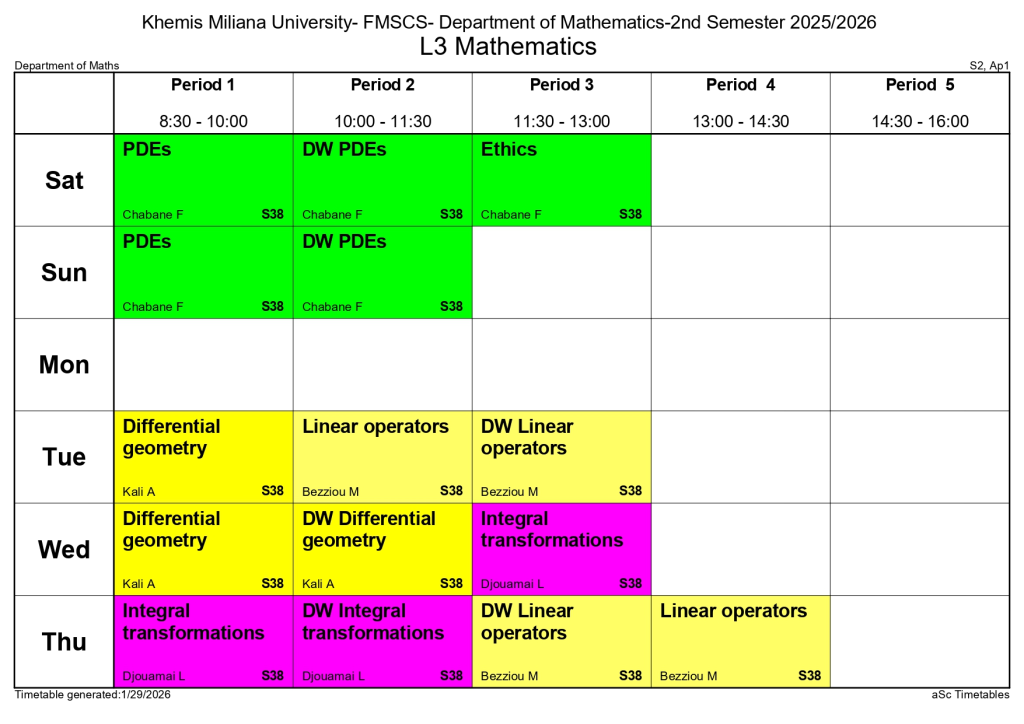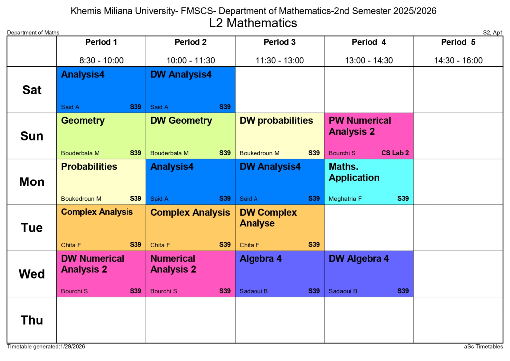 Timetable of the Department of Mathematics – Second Semester